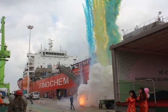 2017年5月9日,在我司碼頭隆重舉行了38K(船體號(hào):HT-CT38-005)不銹鋼化學(xué)品船的命名&交船儀式,該船為中化船務(wù)有限責(zé)任公司建造,命名為“SC HERCULES”。公司領(lǐng)導(dǎo)、船東、船檢代表等參加了該儀式。