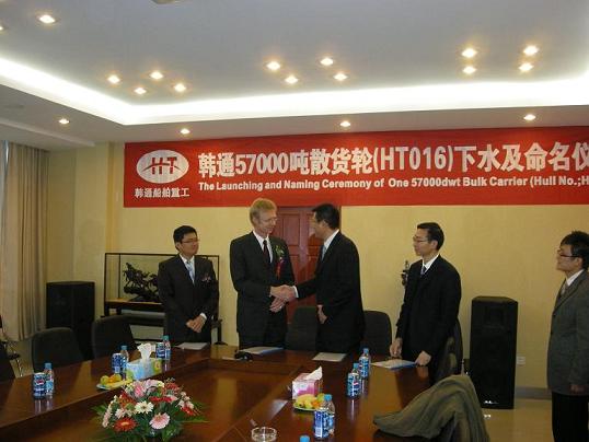 3月27日下午3:30,在韓通重工的1#船臺,隆重舉行了PD船東的首制57000噸散貨輪(船號:HT016)的下水儀式,參加儀式的有船東代表、LR船級社、貿(mào)易公司代表、銀行代表等相關人員。公司領導孟成君董事長、武亦文總經(jīng)理參加了儀式,并發(fā)表了熱情洋溢的講話,在武亦文總經(jīng)理的講話中,他代表孟成君董事長感謝船東的理解和支持,感謝貿(mào)易公司和銀行的大力支持。該首制船的成功下水也將韓通與國際知名船東PD的合作又向前推進了一大步。儀式后,又舉行了HT017的上臺儀式,并在公司5#會議室簽訂了下水和上臺的相關文件。
