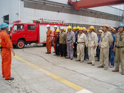 6月15日上午10:30,在江蘇韓通船舶重工有限公司碼頭一艘正在舾裝中的57000噸散貨輪(船體號(hào):HT003)主甲板艏樓濃煙滾滾,刻間火光沖天。單船項(xiàng)目組成員和安全組長(zhǎng)立刻嘗試用移動(dòng)滅火器滅火,但是因火源太大,小型滅火失敗。此刻安全組長(zhǎng)拉響警報(bào)請(qǐng)求支援,一場(chǎng)消防船舶滅火疏散演習(xí)在濃煙烈火和警報(bào)聲中拉開了帷幕。韓通重工消防隊(duì)接警出動(dòng),出動(dòng)消防車一輛,消防員五名,迅速趕赴火場(chǎng)撲救火災(zāi)。同一時(shí)刻船上項(xiàng)目組通知現(xiàn)場(chǎng)作業(yè)人員關(guān)閉氣源、電源,及時(shí)組織作業(yè)人員撤離現(xiàn)場(chǎng)。而起重組啟動(dòng)應(yīng)急吊籠,消防員在八分鐘之內(nèi)達(dá)到火災(zāi)現(xiàn)場(chǎng)。安全人員將船上作業(yè)人員百余人疏導(dǎo)到緊急集合點(diǎn)。上午10:45,消防員成功撲滅火災(zāi)。