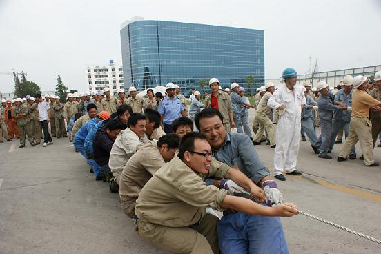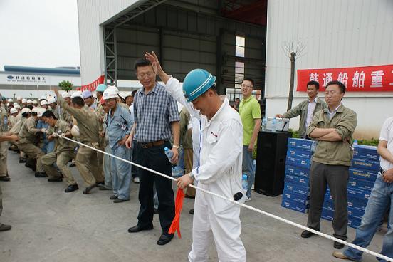 2009年7月17日下午16:00,韓通船舶重工首屆“人和杯”拔河比賽在公司24米主干道上隆重舉行。首先,武亦文總經(jīng)理進(jìn)行了開幕致詞,充分肯定了這次活動(dòng)的意義,并對(duì)參賽人員進(jìn)行了鼓勵(lì);陳林軍副總經(jīng)理宣講了比賽規(guī)則以及比賽陣容。隨后,比賽正式開始。