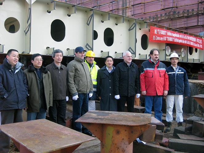 我司為德國船東建造的57000噸散貨輪(船體號HT023)于2009年12月19日上午9:30在我司1號船臺2號滑道舉行上臺儀式,該船入英國勞氏船級社。船東SPLOSNA PLOVBA公司董事局主席EGON BANDELJ一行,陳興副總,PD項目駐場經理Babic,英勞船級社駐場經理王谷正和貿易公司弘業(yè)參加了該儀式。