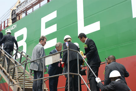 坎貝爾航運(yùn)公司洛厄爾·莫蒂默先生、格雷格中國有限公司執(zhí)行總裁約翰·科芬先生、加爾布雷思公司尼爾·羅基森先生、圣母埃絲特·威廉斯女士、英國勞氏船級(jí)社中國中部地區(qū)經(jīng)理阿蘭 ·斯瓦勃格先生以及江蘇韓通船舶重工有限公司總經(jīng)理武亦文先生等參加了該儀式。