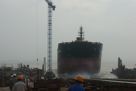 我司為DA SIN船東建造的57000噸散貨輪(船體號(hào)HT066)于2010年10月22日下午15:15在我司2號(hào)船臺(tái)舉行下水儀式,該船入LR,計(jì)劃于2011年初交船。陳林軍常務(wù)副總及船東船檢代表參加了該儀式。