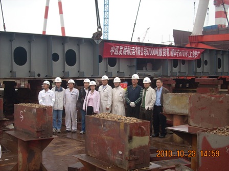 我司為中遠(yuǎn)發(fā)展航運(yùn)有限公司建造的57000噸散貨輪(船體號(hào)HT078)于2010年10月23日下午14:30在我司2號(hào)船臺(tái)舉行了上臺(tái)儀式,該船入CCS船級(jí)社,計(jì)劃2011年4月30日交船。陳興副總,李繼念副總及船東代表參加了該儀式。