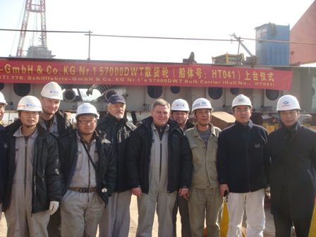 57000噸散貨輪(HT041)上臺 2011年1月7日我公司為德國CONTI船東建造的57000噸散貨輪(HT041)在新韓通船臺順利上臺,該船入LR船級社。