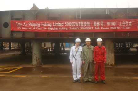 我司為 春安 船東建造的57000DWT散貨輪(船體號(hào):HT100)于2011年12月21日上午10:00在我司1號(hào)船臺(tái)舉行了上臺(tái)儀式,該船入NK船級(jí)社。李繼念副總及船東船檢代表參加了該儀式。