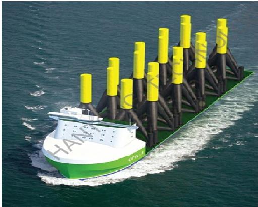 韓通集團(tuán)近日在漢堡與德國(guó)設(shè)計(jì)公司簽訂了船舶設(shè)計(jì)合同,共同聯(lián)手研發(fā)風(fēng)機(jī)基礎(chǔ)運(yùn)輸船,以確保我司制造的風(fēng)機(jī)基礎(chǔ)整件及部件順利、及時(shí)交付。該船在原有船型的基礎(chǔ)上進(jìn)行優(yōu)化,并且引入LNG雙燃料系統(tǒng)。根據(jù)現(xiàn)有初步設(shè)計(jì),該船長(zhǎng)約215米,船寬在原有基礎(chǔ)上加至51米,最大設(shè)計(jì)載重量達(dá)到近四萬噸。根據(jù)現(xiàn)有設(shè)計(jì),單趟運(yùn)輸甲板可有效放置18個(gè)風(fēng)機(jī)基礎(chǔ)(三腳樁)。
