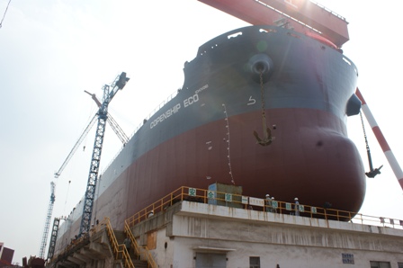 2013年7月8日,我司為希臘船東Loadline建造的64000噸散貨輪(HT64-115)在韓通2號(hào)船臺(tái)成功下水,該船入NK船級(jí)社。于澤彬總經(jīng)理、周義慶副總經(jīng)理、高振成副總經(jīng)理、船東代表及船級(jí)社代表參加該儀式。