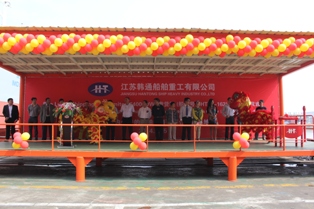 我司為寶源建造的64000噸散貨輪(HT64-162)達到了交船狀態(tài),2014年9月25日在我司碼頭舉行了隆重的交船儀式,該船入DNV.GL。交船儀式開始前船東船檢代表等參觀了該船,并給予很高的評價。2014年9月26日該船駛離韓通碼頭,至此,該船提前52天成功交付。